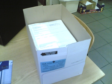 papieren van de lading op. Ik krijg mijn map met vrachtbrieven en een doos. Doos??? Nee, geen domme griet.