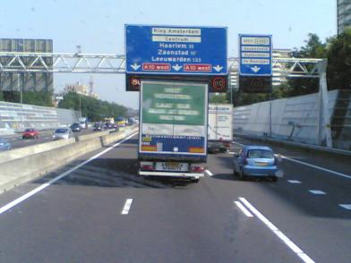 Ik rij over de A10 west, Achter een vrachtwagen waar weer eens reclame op staat. (Zie foto) Nou is dat in nederland helemaal normaal dat er reclame op vrachtauto's