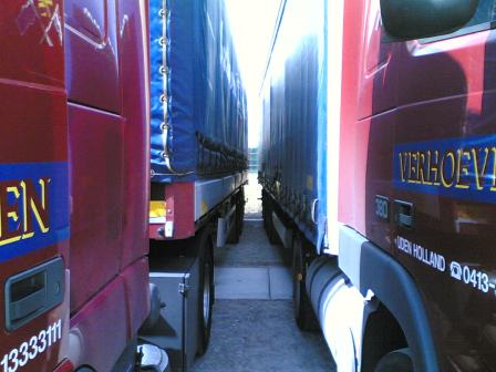 Ik parkeer een vrachtauto bij mijn werkgever op het terein. En dan komt er een colega naar mij toe (Barry Jansen) die zegt dan doodleuk : "Tja daan, zo kun je niet parkeren hij staat te scheef" Hoezo ? Kijk maar naar de lijnen in beton! (foto rechts). En inderdaad hij stond niet helemaal recht. Barry vond dat dit toch ook mijn site moest komen.